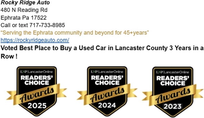 We buy quality vehicles and sell them under book and market values with our Low, Market driven No Hassle Pricing Policy -so YOU WIN! While you are doing some shopping around, you will see our miles and prices are usually lower then our competitors, plus all of our vehicles go through our inspection process. Most vehicles get Pennsylvania State inspected and fresh service as well. We know what we’re selling, due to the fact that we have our own onsite service department. Also do not forget that we offer incredibly low financing options, rates often times lower than what you can get at your own bank. (Loan term/vehicle/purchaser must qualify) Submit a credit application and we can handle all the paper work for you. Banks and credit unions often offer us lower rates than you the consumer can get on your own going into the branch. (They reward us for the high volume of business we send them throughout the year) Plus you do not have the headache of dealing with the banks on your own. Win! Win! We also have extended service contracts available on all of our vehicles. We can extend your car's factory bumper to bumper coverage for just a little more money. Simply put, we GIVE YOU MORE for less! Call and Stop by Today! We are here to help you! For Latest information, more photos, and walk around YOUTUBE videos, go directly to OUR website: WwW.RockyRidgeAuto.Com Want to find out what finance rates are available for you? Go to http://RockyRidgeAuto.com/financing/ and SECURELY submit a credit application through our website. Thanks so much for taking the time to check out Rocky Ridge Auto, and we look forward to meeting you in the future. ONLY CERTIFIED BANK CHECKS WILL BE ACCEPTED FROM OUT OF STATE CUSTOMERS, Go to our - What to Bring Section - of our website for details about what is needed when purchasing a car.